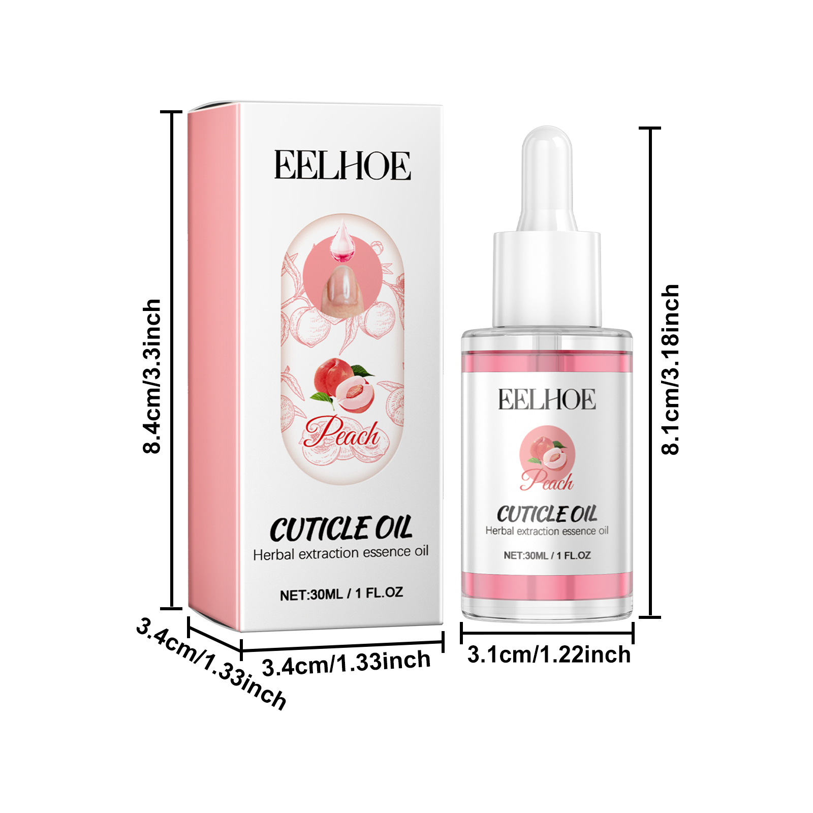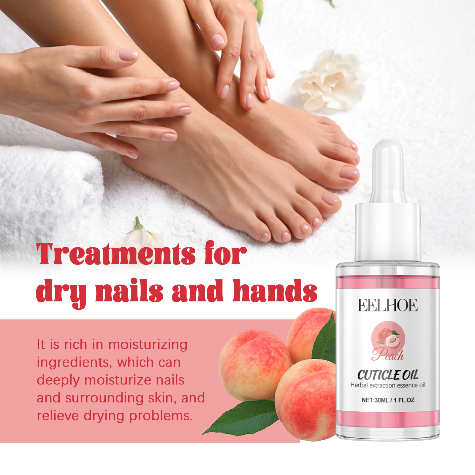 Our Cuticle Oil contains Runus Persica(Peach) Fruit Extract, Simmondsia Chinensia(Jojoba) Seed Oil, Camellia Sinensis Seed Oil. It moisturizes dry nails and hands to keep them healthy, nourishes fragile nails and dry cuticles, and enhances the appearance of nails, making them more beautiful and shiny. Its application is simple: Clean your nails with a wet towel, apply this product to your nails and the skin around your nails, and gently massage the nail bed to help absorb. It can deeply moisturize nails and surrounding skin and relieve dryness.